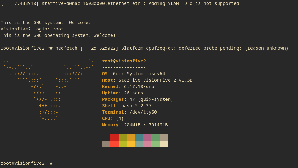 jump to repliesSo now I can boot straight into a barebones GNU Guix system on my StarFive VisionFIve 2 RISC-V board from a MicroSD card. I had to patch "gnu/bootloader/u-boot.scm" in Guix to make this work: